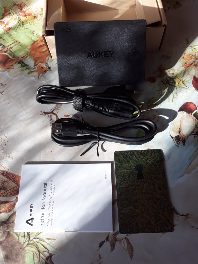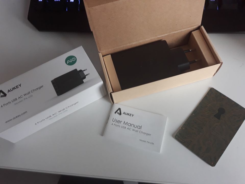 Le contenu de la boite étant, le Aukey PA-T11 Chargeur Secteur, 1 câble Adaptateur d’Alimentation Détachable de 0,8 m, Manuel d’Utilisation, Carte de Garantie de 24 Mois et pour finir vous aurez un câble USB.