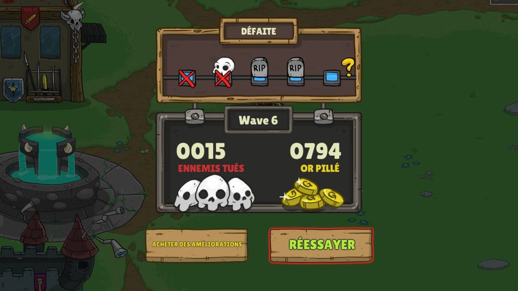 Si votre cristal se casse, votre game sera terminé et vous vous verrez attribuer l’argent récolté en tuant les ennemis lors de la vague ou des vagues où vous aurez survécu.