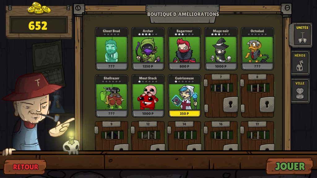 Une page dite « Unités », où il s’agît d’améliorer les alliés que vous avez envie de utiliser, pour cela il faut juste cliquer dessus et appuyer sur le gros bouton jaune et hop l’amélioration sera effectué.