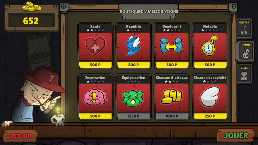 La seconde page concerne votre héros avec des améliorations tel que votre vie, votre rapidité et bien d’autres choses que vous allez pouvoir découvrir directement dans le jeu !