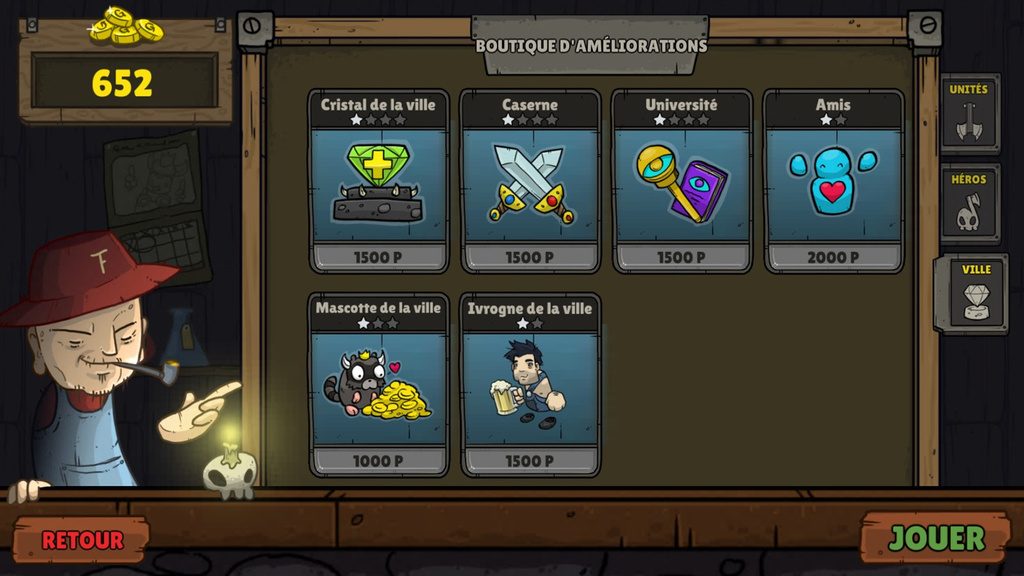Pour terminer, une page « ville » qui comme son nom l’indique vous permettra d’améliorer ou d’ajouter des choses dans le village tel que par exemple améliorer la vie du cristal, ajouter un « ivrogne » qui vomira pour retenir les ennemies, un animal qui vous suivra de partout pour récupérer tout l’argent au sol et bien d’autres encore !