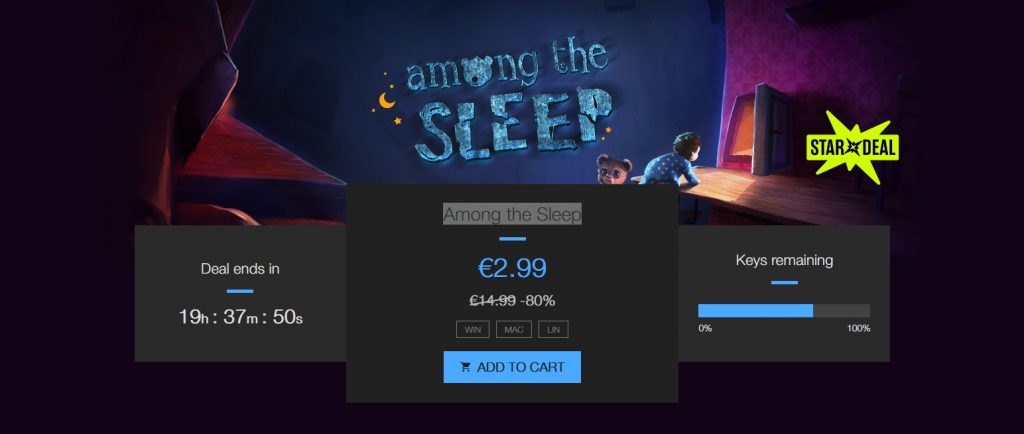 Pour le premier jeu à petit prix, nous allons rester sur le site de Bundlestars ou vous allez pouvoir vous procurer Among The Sleep pour trois fois rien car oui au lieu de l’avoir pour 14,99€ vous l’aurez pour seulement 2,99€ donc si vous êtes fan de jeu « horreur »/aventure, ne vous retenez plus et foncez l’acheter avant que cette offre prenne fin. (lien sur l’image, cliquer dessus pour vous y rendre)