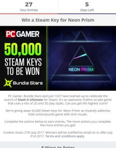 Je ne vais pas perdre mon temps et je vais passer directement à du lourd car oui le site BundleStars vous propose de pouvoir remporter 50 000 clés de jeux Steam, je pense qu’il n’y a pas à hésiter car au moment où j’écris cet article il ne vous reste plus que 5 jours pour participer, pour cela vous allez juste devoir cliquer sur l’image ci-dessous et remplir 8 petites étapes pour avoir plus de chance pour gagner.