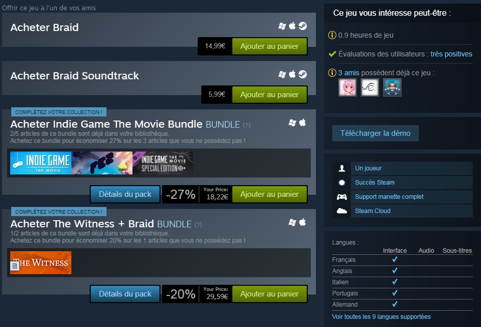 Ce n’est pas tout, si vous êtes indécis, vous pouvez aussi tester le jeu directement sur la page steam du jeu où vous pourrez voir un bouton « télécharger la démo » dans la colonne de gauche (cliquer sur l’image pour vous rendre sur la page du magasin) !