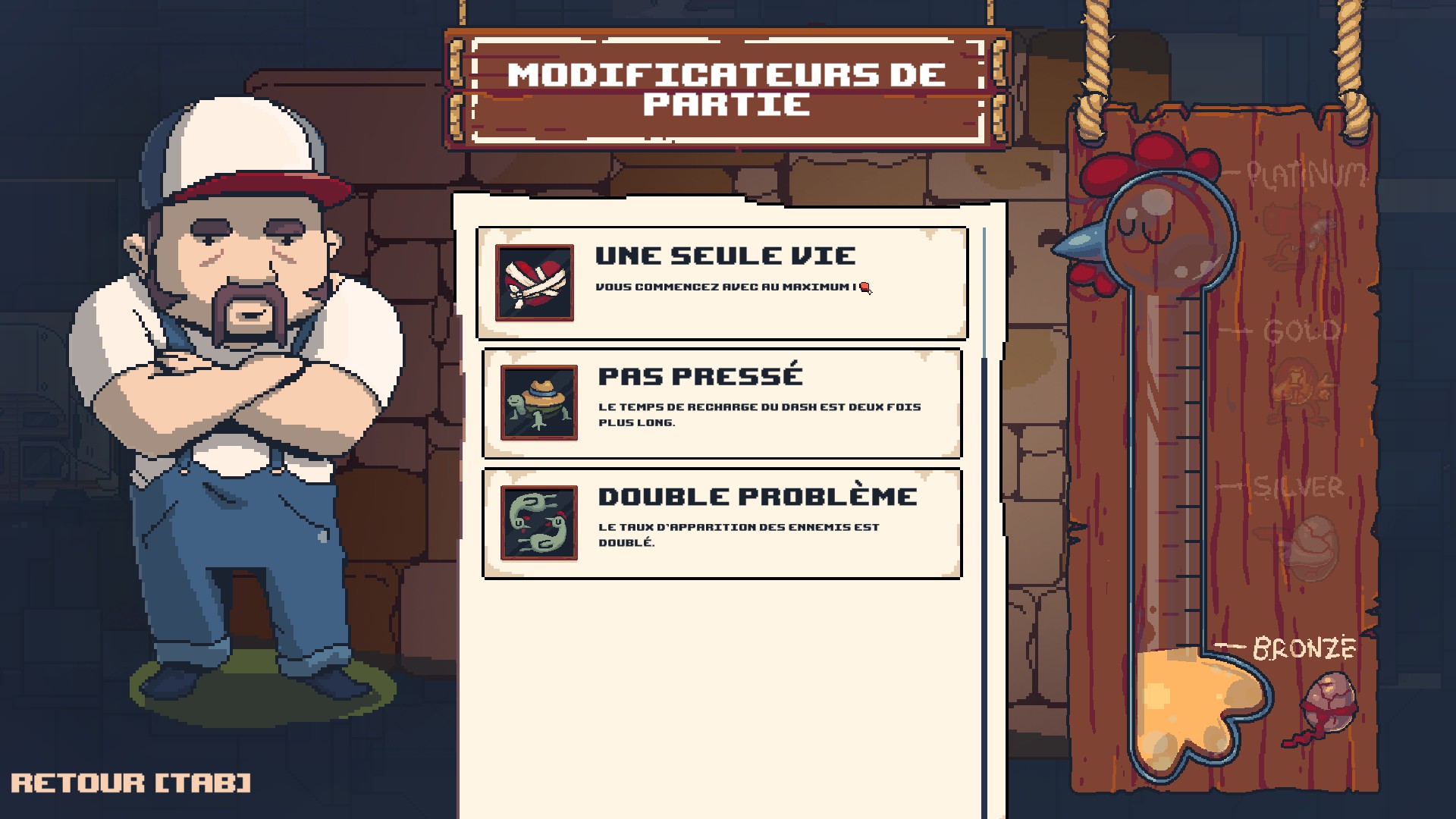 Celui qui est en bas à droite, vous permettra de modifier votre partie, vous pourrez ainsi corser votre jeu en commençant le donjon avec un seul cœur, en augmentant la cadence de tir ou encore en doublant le nombre d’ennemis qui apparait.