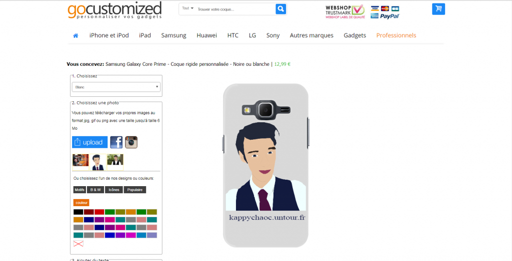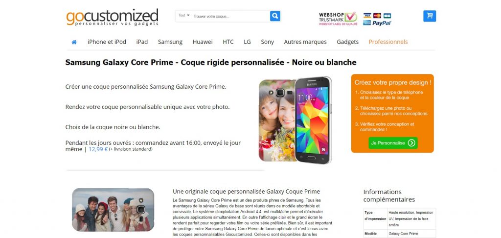 Une fois que vous aurez choisi la coque qui vous donne envie, je vous invite à directement cliquer sur le bouton « personnaliser », une seconde page va s’afficher avec un bouton vert avec écrit « je personnalise », cliquez dessus. Pour ma part, j’ai pris la coque rigide pour le Samsung Galaxy Core prime, si vous souhaitez vous aussi avoir la même, cliquez directement sur l’image.