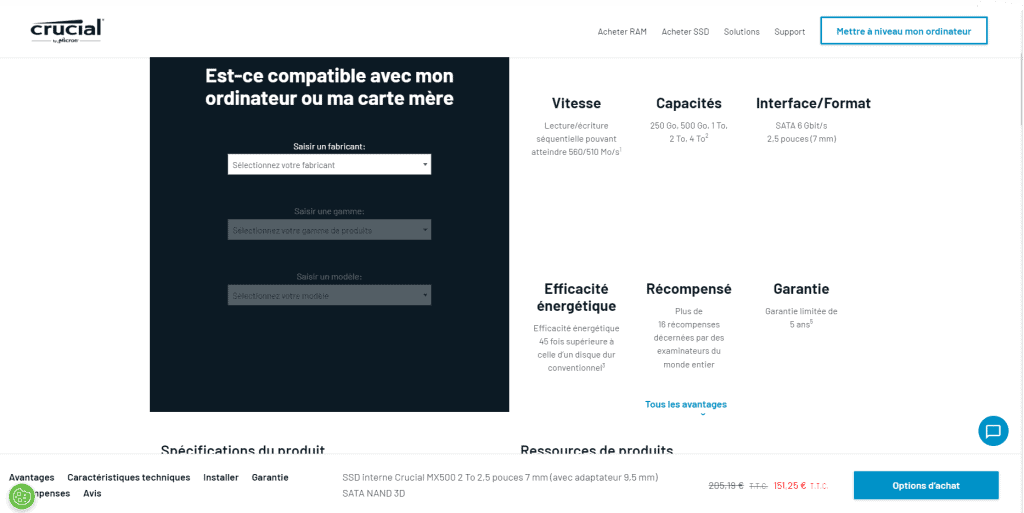 Ici on voit qu’en plus du prix habituel, vous avez une promotion qui est en cours, un gros point fort de Crucial, qui en propose souvent sur sa large gamme de produit.