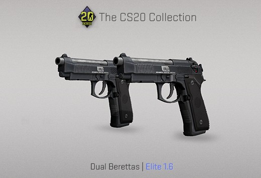 Nous avons en premier le Dual Berettas Élite 1.6, sobre, à titre personnel j’ai presque même l’impression qu’il n’y a aucun skin dessus.