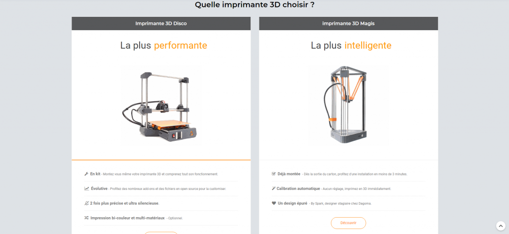 Il y a par exemple l’imprimante 3D Disco qui est en kit, que vous pourrez la faire évoluer dans le temps grâce aux add-ons, elle est silencieuse et précise en plus d’être bi-couleurs et de nombreux matériaux compatibles.