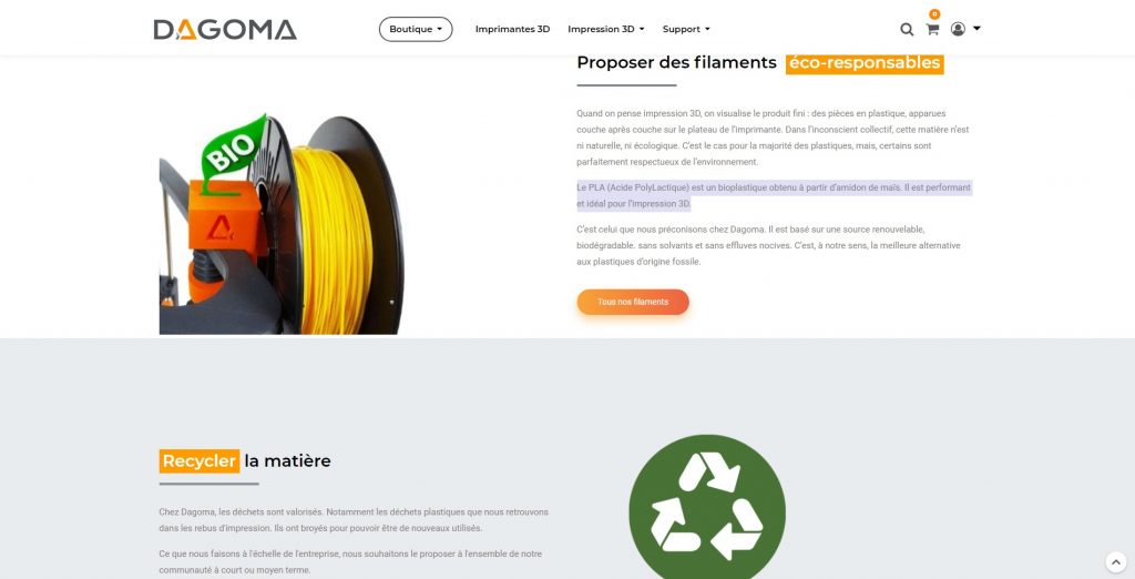 Parmi les autres engagements, on retrouve l’écologie par exemple. Effectivement, certains filaments proposés sont éco-responsables, comme le PLA.