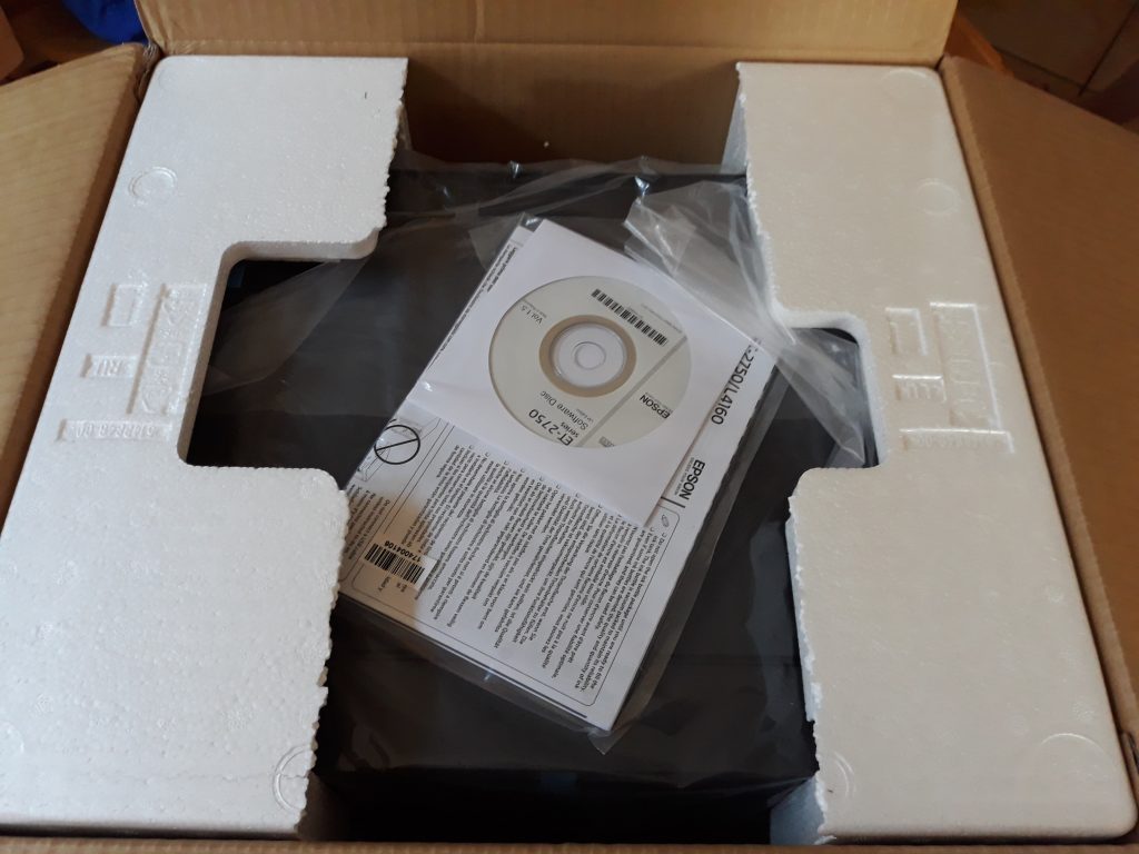 Déjà, une fois le colis ouvert, nous apercevons le polystyrène, la notice et le CD d’installation du pilote de l’imprimante.