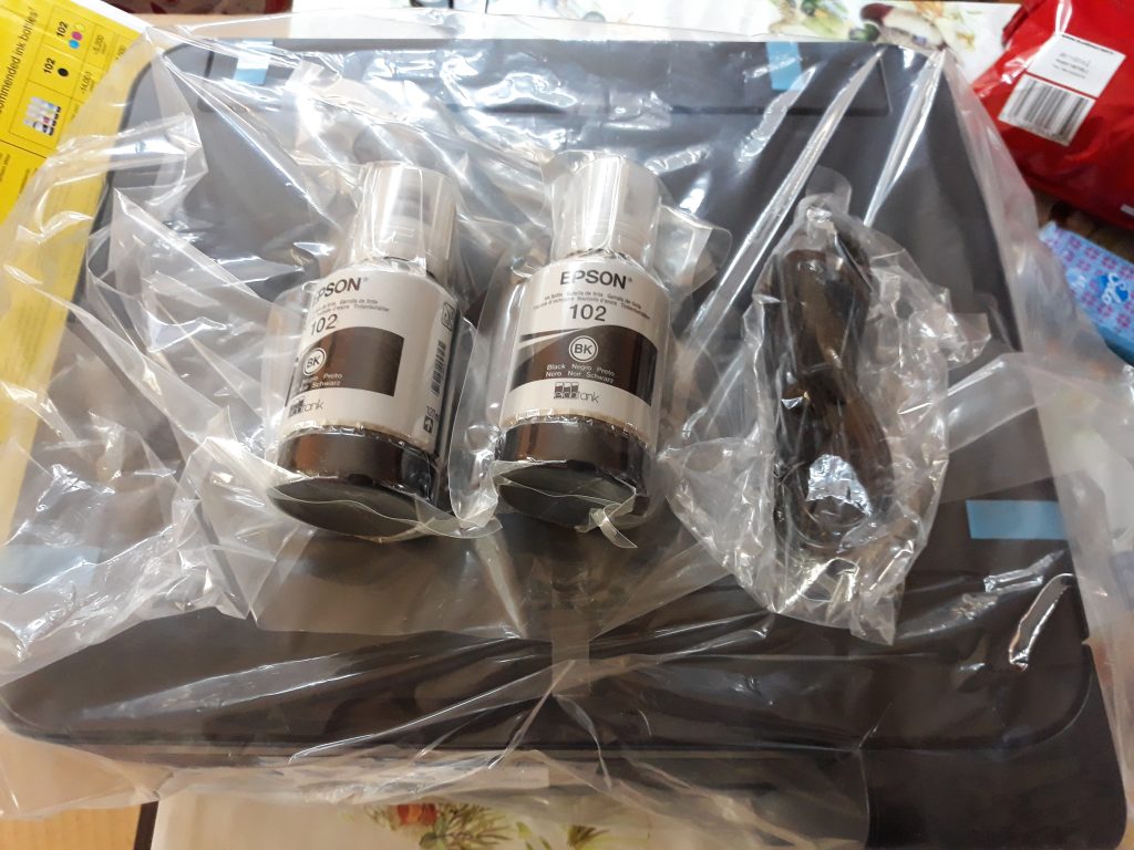 Étant curieux, j’ai décidé de déplacer directement l’imprimante à l’extérieur de sa boite, car je ne voyais pas de bouteille d’encre noire. J’ai été agréablement surpris, car ce n’est pas non pas une, mais deux bouteilles que j’ai trouvé au fond du carton !