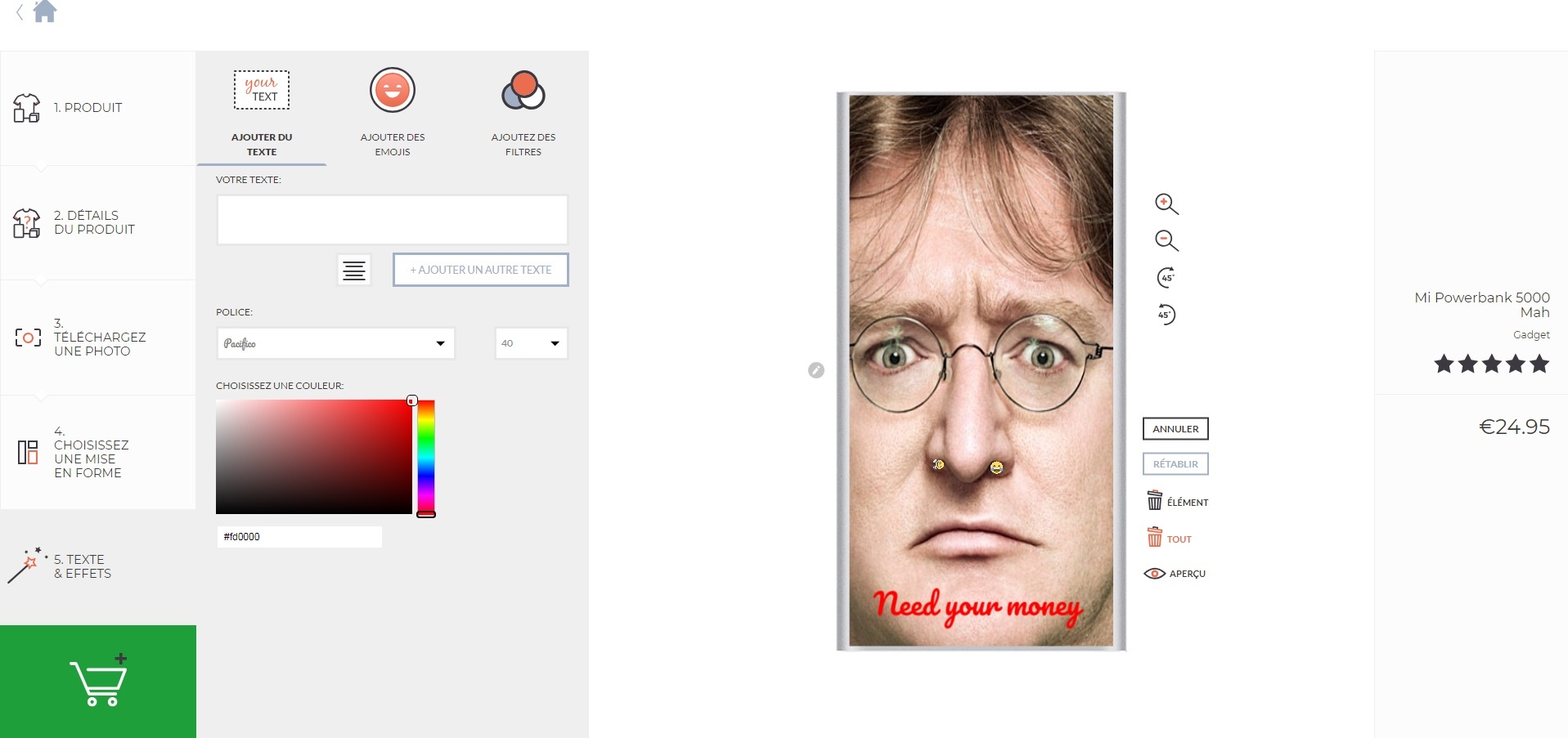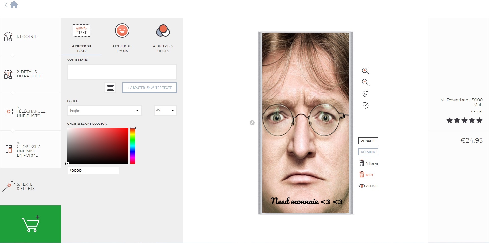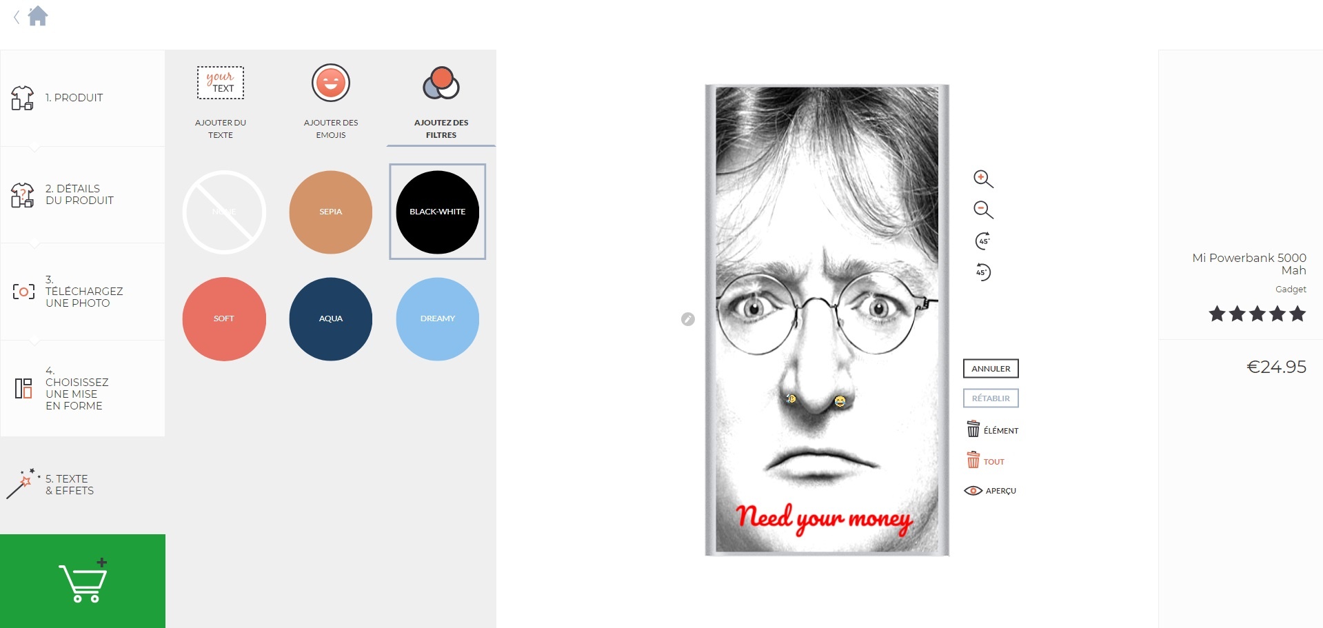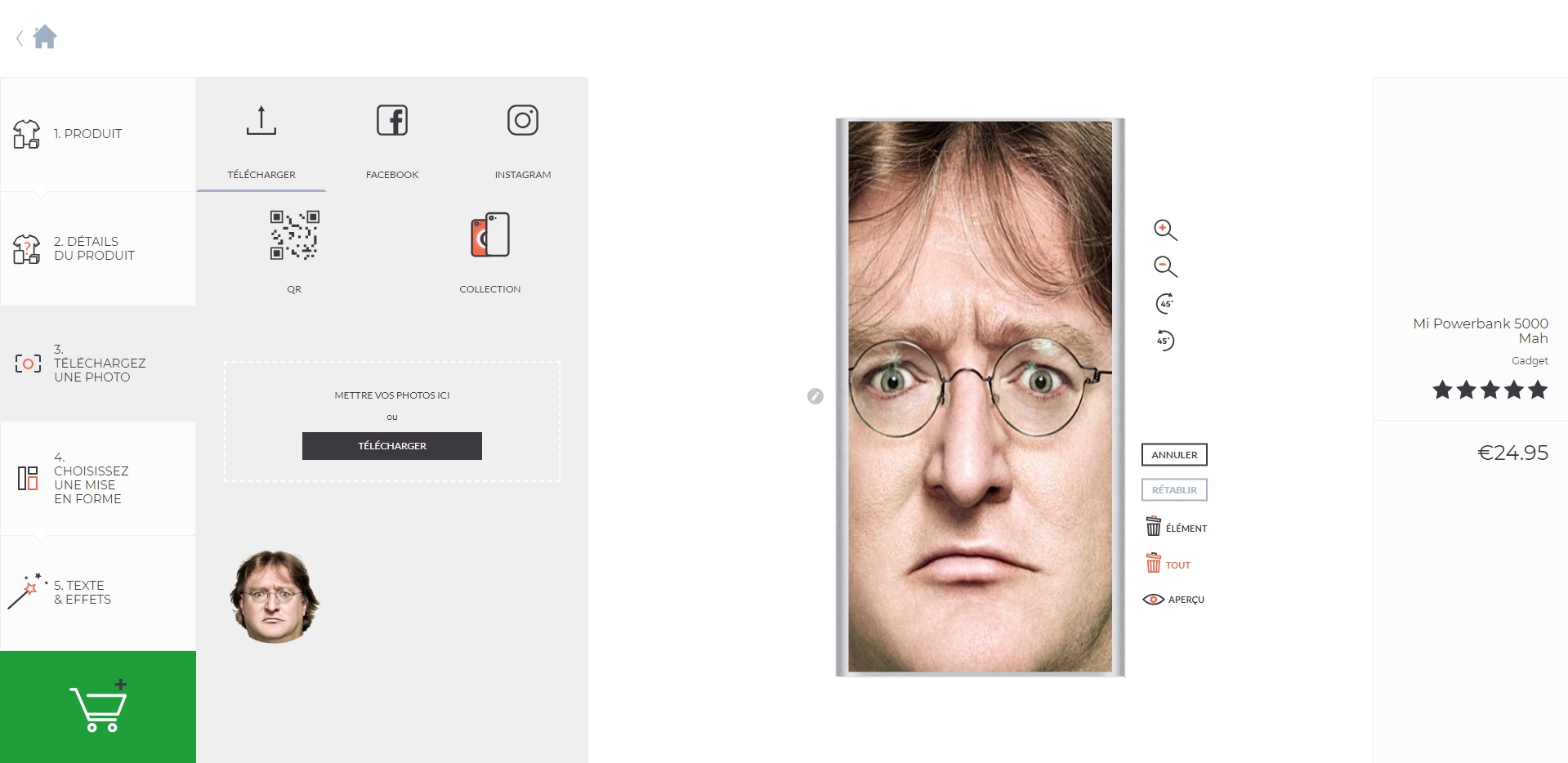 Il vous suffit d’un clique en plein milieu du produit imagé sur la page, d’importer l’image de votre souhait directement sur le site, puis de le déplacer à votre guise sur la surface aménagée. Pour être un peu plus précis, je vous ajoute une image juste en dessous.