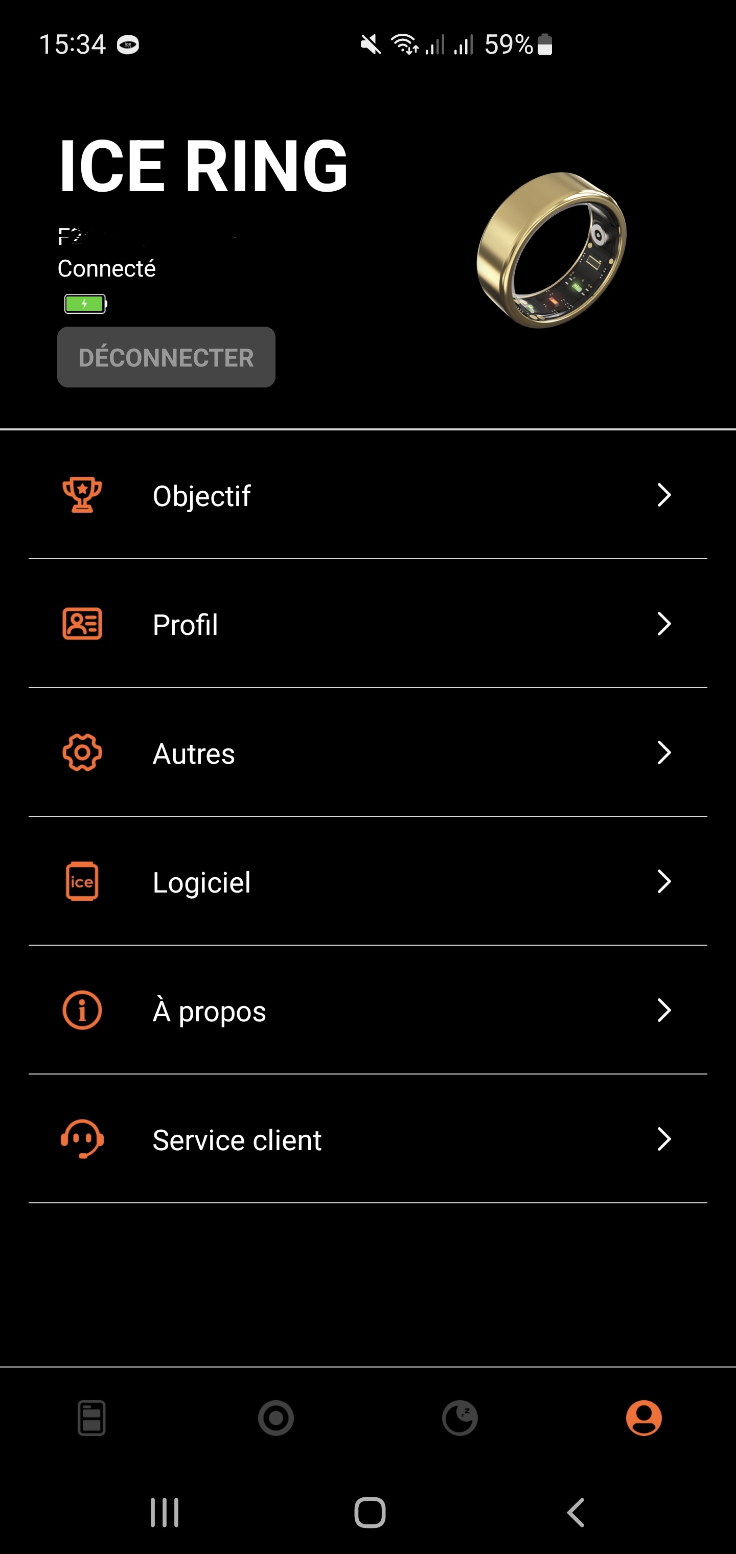 Ici, on peut voir notamment en haut à droite, dans les paramètres, que ma bague est bien identifiée et connectée, ma Ice-Ring est actuellement en charge.