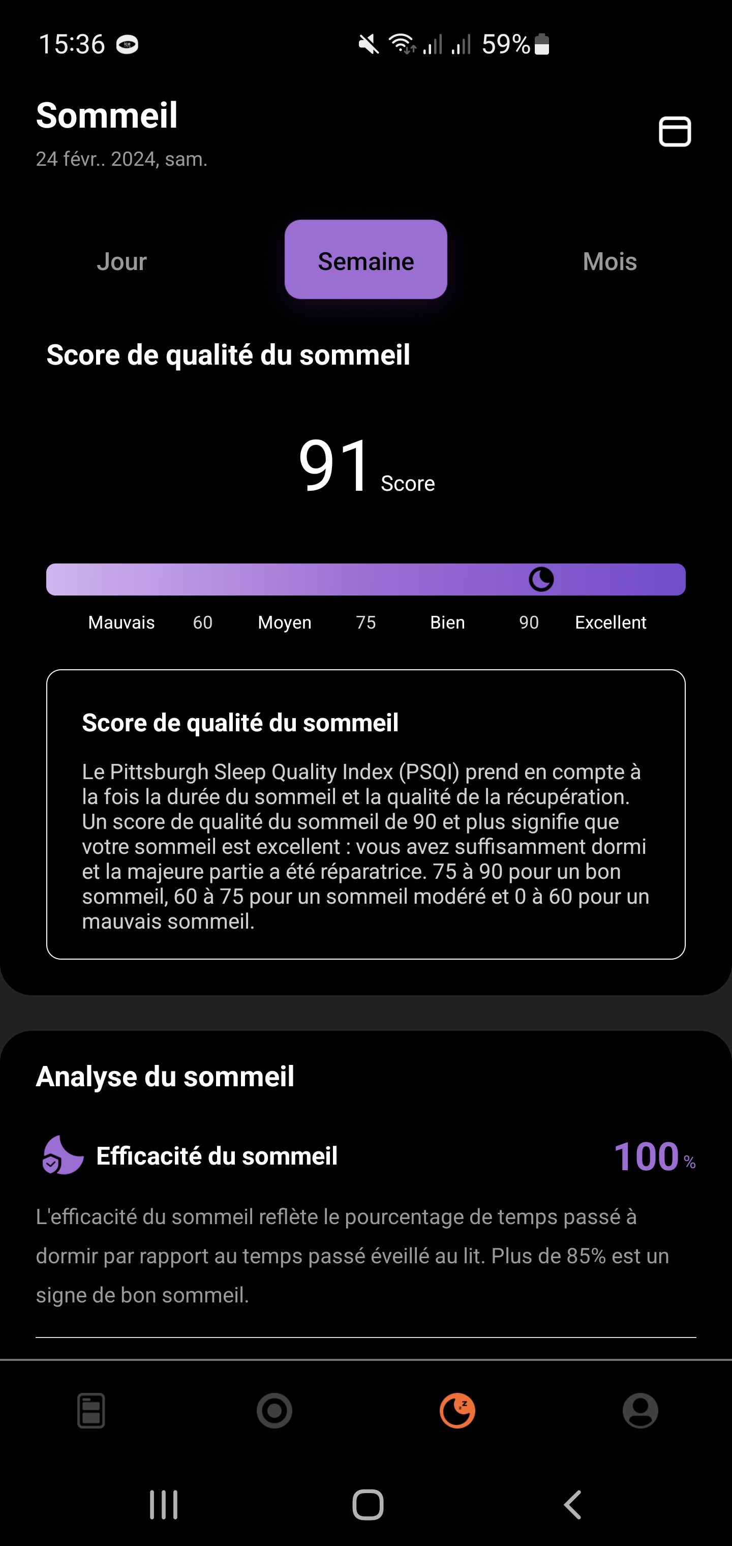 Qu’il s’agisse du nombre d’heures que vous aurez dormi, le nombre d’heures détaillé en plusieurs partitions, celle du sommeil profond, léger et le REM (rêve), ainsi qu’en dessous la qualité de votre sommeil, suivi de l’efficacité de ce dernier.