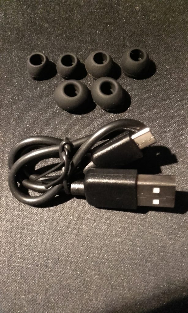 Passons au second sachet, un peu plus plein cette fois-ci. Il y a plusieurs embouts en plastique avec plusieurs tailles afin que vous puissiez trouver votre bonheur, ce qui est une très bonne chose. Il y a aussi dedans le câble USB permettant ainsi de recharger tranquillement ses écouteurs sur un pc.
