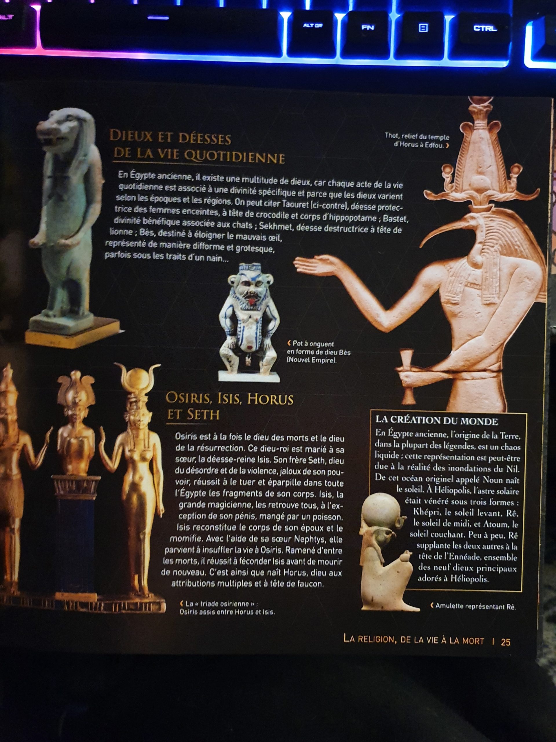 Comme vous le constaterez sur ces deux photos, les Égyptiens et les Grecs n’avaient pas les mêmes dieux, et dans les deux livres, vous retrouverez des pages qui sont dédiées à toute cette partie.