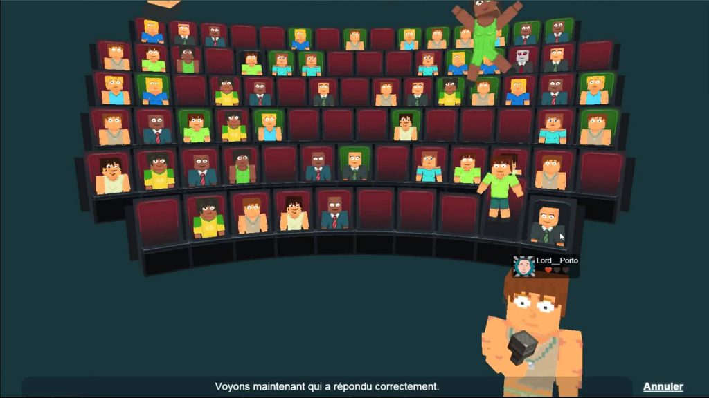 C’est un jeu en ligne composé d’un animateur et de plusieurs candidats, le but étant que l’animateur soit en direct (sur Twitch, Youtube….) et pose des questions aux spectateurs assis dans les estrades.