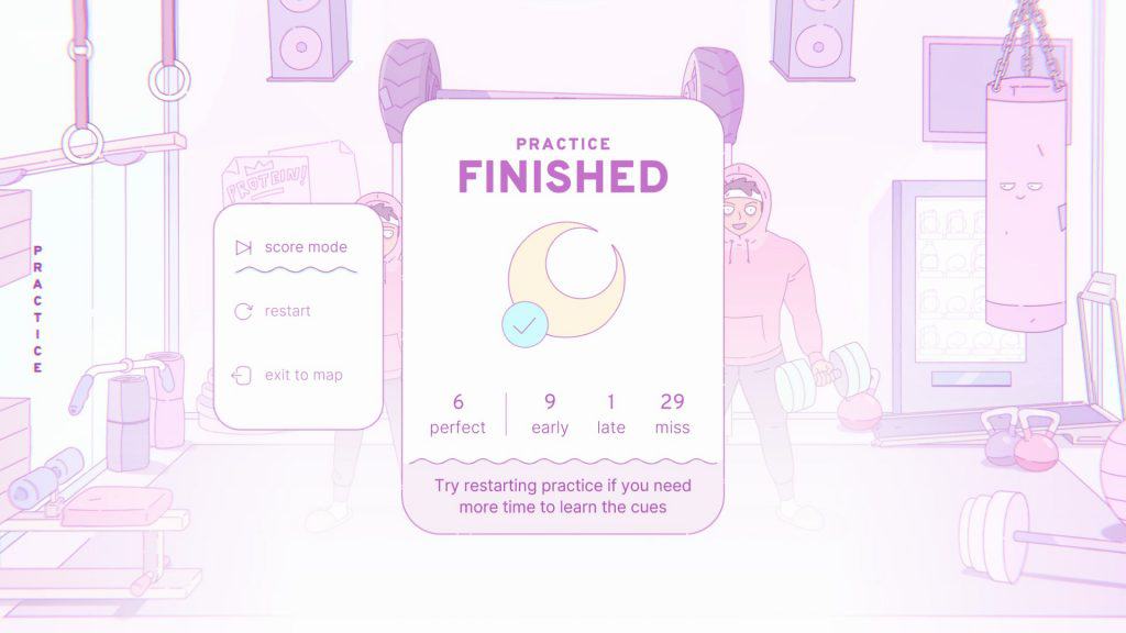Sachez qu’à chaque étape du jeu, vous serez guidé pour vous dire où vous en êtes, par exemple sur cette image (ci-dessous), je venais de terminer le mode « Practice », on peut voir que j’ai bien galéré puisque dans mon résumé on peut voir que j’ai eu que 6 perfect, j’ai été en avance 9 fois, que j’ai appuyé 1 fois trop tard et que j’en ai manqué 29.