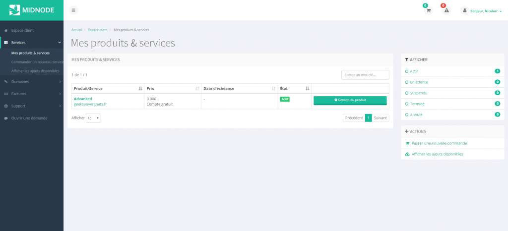 Enfin bref, voici à quoi ressemble l’interface montrant vos produits & services :
