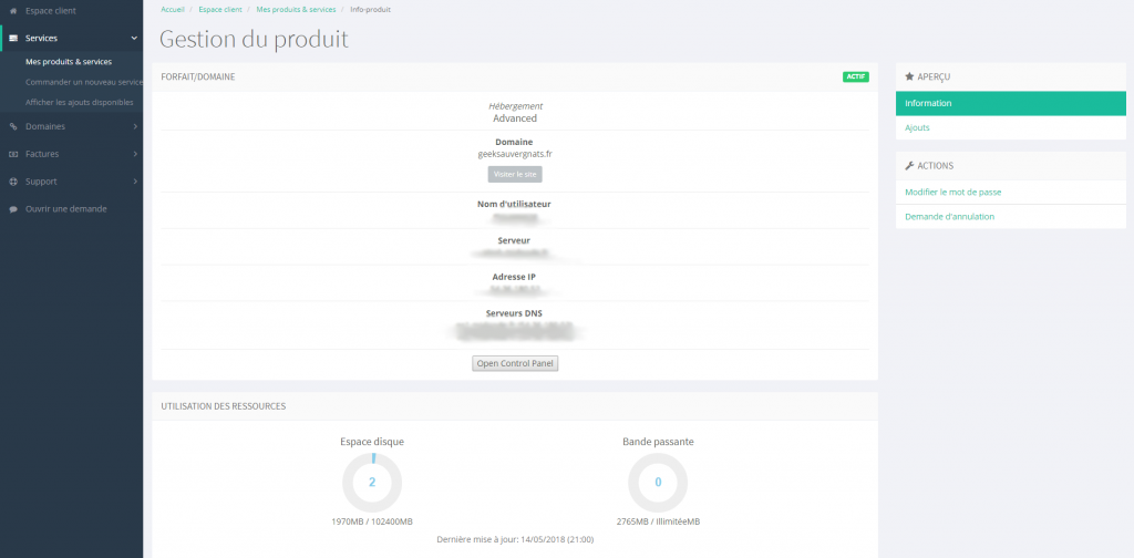 Après avoir pu voir vos produits & services, vous allez pouvoir les gérer en appuyant sur le bouton « gestion du produit » du service concerné, vous tomberez face à une seconde page vous indiquant toutes les informations de votre serveur tel que votre forfait/domaine ou encore l’utilisation des ressources.