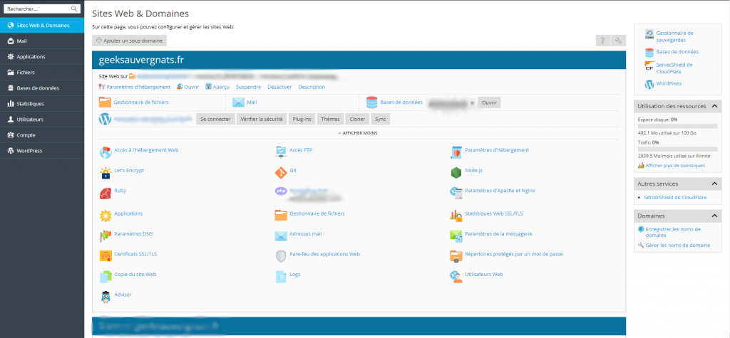 Comme vous le constaterez, il s’agit de l’hébergeur de mon association Geeks Auvergnats, je ne pourrais pas vous montrer toutes les informations qu’il y a, ni toutes les catégories puisqu’il y a des informations privées et aussi par ce que l’article serait finalement un roman !