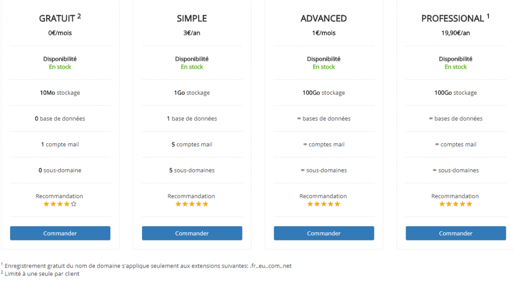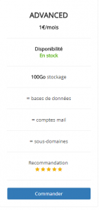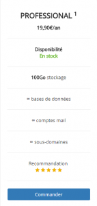 Le prix est de 19,90€/an avec 100Go de stockage, des bases de données illimitées, des comptes mails illimités et pareil pour les sous-domaines. La différence avec l’offre Advanced ? Vous pourrez enregistrer gratuitement un nom de domaine, toute fois cela s’applique seulement aux extensions suivantes: .fr,.eu,.com,.net