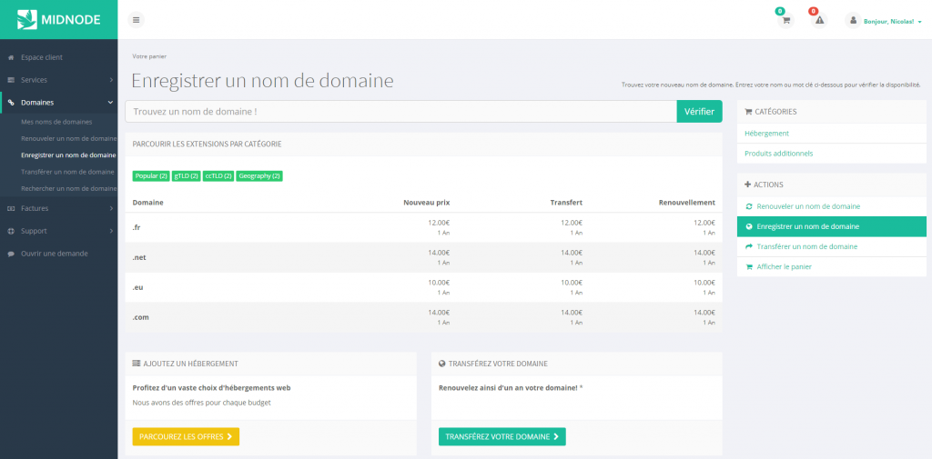 Parlons maintenant de l’offre que propose Midnode concernant l’achat d’un nom de domaine, car oui sans ça ce n’est pas possible de pouvoir faire fonctionner votre site web :