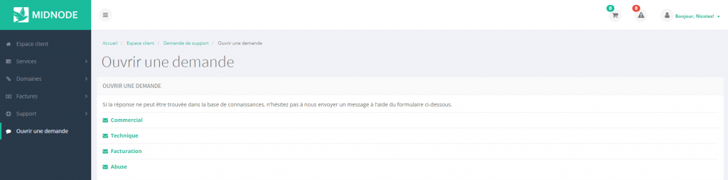 Pour finir cet article, je vous indiquerai que vous pouvez joindre le service technique sur le site de Midnode en vous connectant puis dans la colonne de gauche il vous suffit de cliquer sur « ouvrir une demande » afin d’ouvrir un ticket, sinon, vous pouvez les joindre directement sur leur Discord où ils offrent un support disponible 24h/24h et 7j/7j ainsi que sur le compte @MidnodeFR ou encore sur leur support chat directement sur leur site.