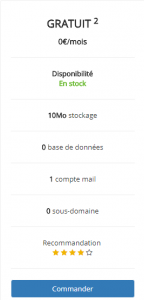 Vous n’aurez pour cette offre aucune somme à payer, vous disposerez de 10Mo de stockage et 1 compte mail. Pour ma part je ne vous recommande pas cette offre si vous souhaitez créer un site web puisque vous aurez besoin de bien plus d’espace pour stocker vos fichiers, vos articles, vos images…toutefois cela peut vous servir pour la création d’un petit site vitrine.