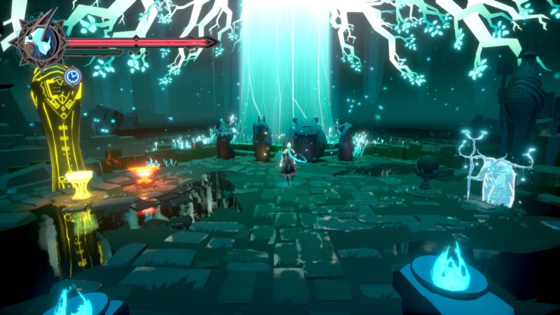 Vous allez par la suite faire enfin la connaissance de la Sorcière, cette femme qui vous parle depuis le début du jeu et vous raconte toute l’histoire. Elle va donc vous expliquer qu’il existe une solution pour sauver le monde, mais avant vous allez pouvoir vous rendre dans la zone de gauche (voir screen ci-dessous) où vous allez méditer devant le calice.