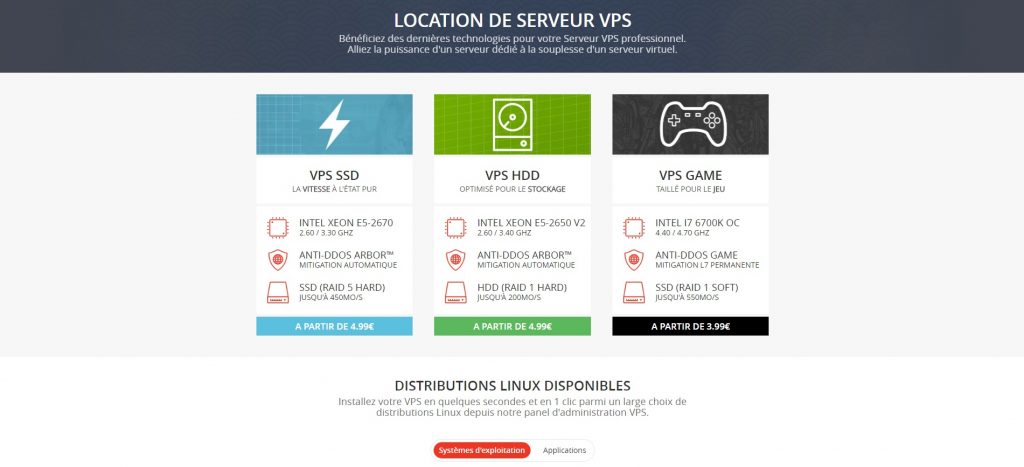 Vous aurez la possibilité d’acheter des serveurs de jeux variés comme ARK par exemple, Strabound ou encore des serveurs vocaux (Mumble, Teamspeak). Enfin, il vous sera possible de louer des VPS SSD, HDD ou encore Game, chacun ayant des caractéristiques diverses permettant de répondre à vos besoins.