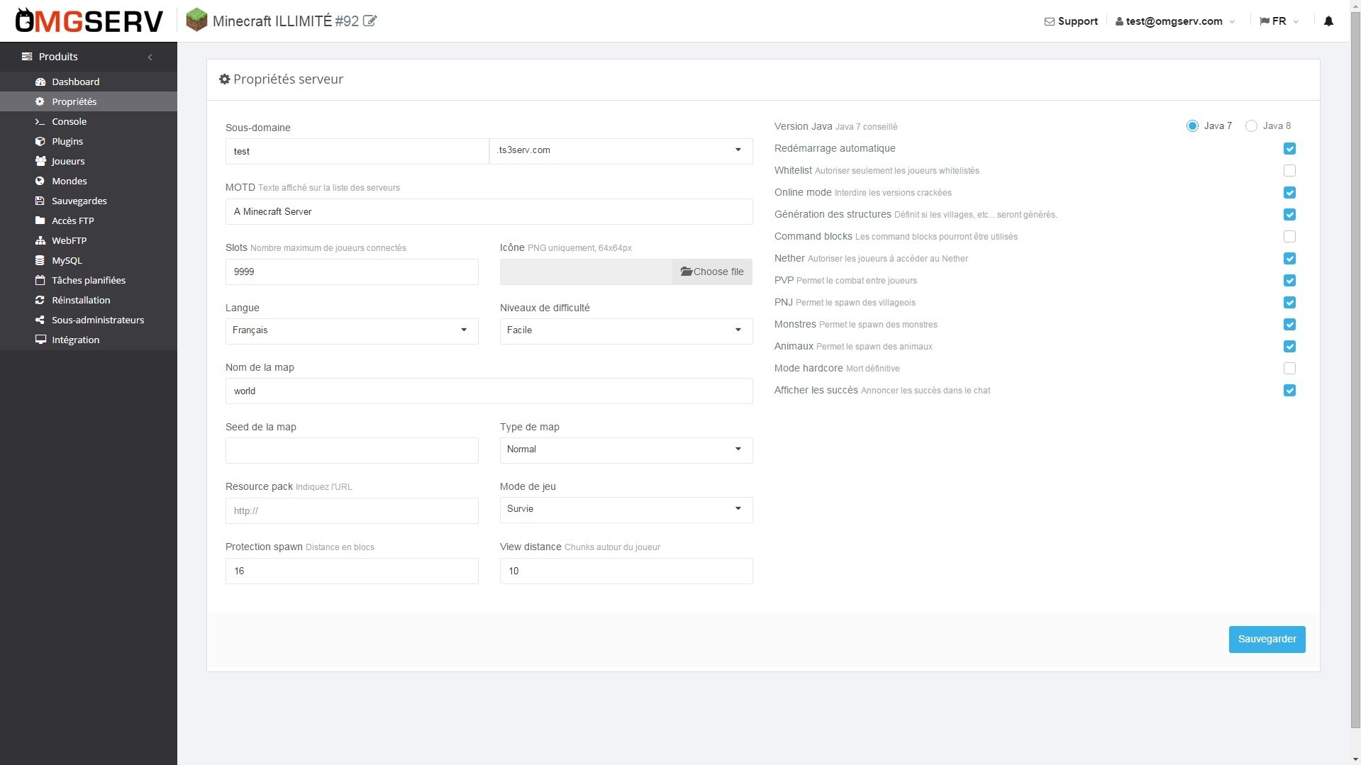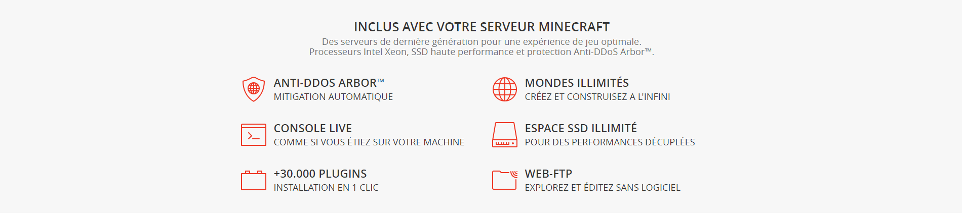 D’autres avantages sont inclus dont un anti-ddos, mondes illimités, console live, espace SSD illimité, + 30 000 plugins et le fameux web-FTP pour vos fichiers ou encore ajouter manuellement des plugins.