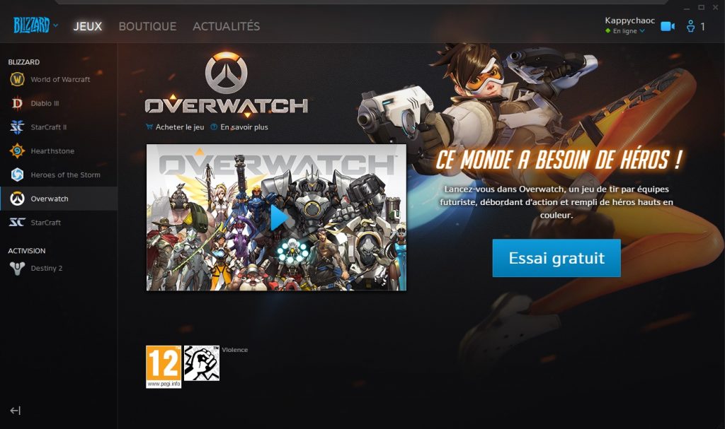 Pour finir c’est sur le luncher que tout se joue, cliquez sur « Overwatch »et un grand carré bleu apparaîtra avec un écriteau « Essai gratuit », il vous suffira de cliquer dessus pour ensuite lancer l’installation, par contre à partir du 26 Septembre 2017, vous n’aurez plus accès au jeu.
