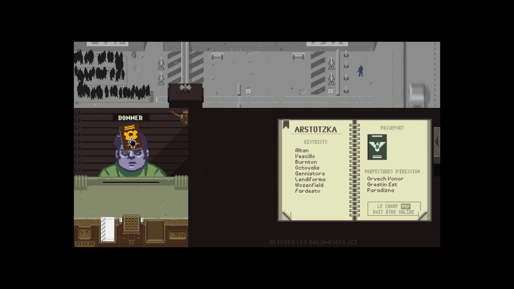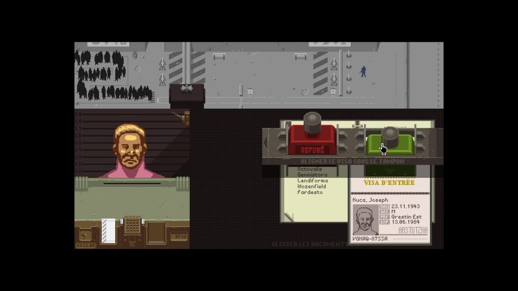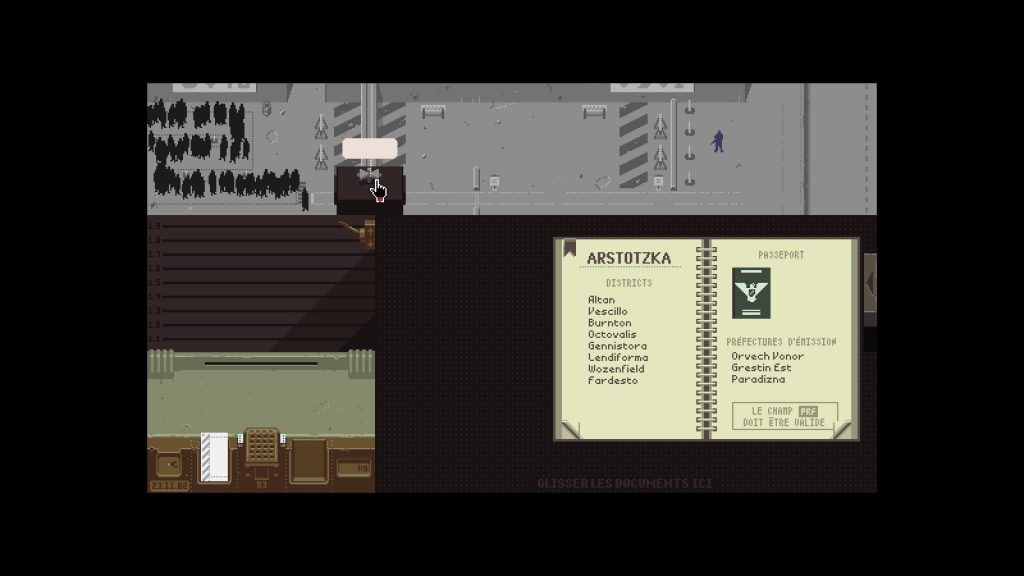 Au début du jeu, il vous suffira de contrôler simplement que la personne qui se présente fait bien partie de ARSTOTZKA grâce à son passeport et un bouquin qui répertorie toutes les villes, si tout est bon il vous faudra cliquer sur la droite afin de faire apparaître deux tampons celui où il est inscrit « Refusé » ou l’autre « Accepté ».