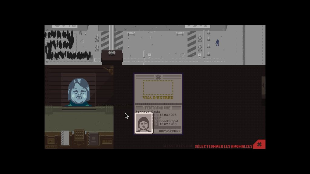 Puis vous allez retourner une fois de plus au boulot et là, une nouveauté sera présente, une sécurité de plus pour rentrer dans le pays sera demandée et cela sera de plus en plus compliqué, car, il faudra être très attentive sinon vous risquez d’être sanctionné et perdre de l’argent, vérifiez donc bien chaque partie de la carte d’identité grâce par exemple, dès le deuxième jour, « le sélectionneur d’anomalies », c’est un triangle visible en bas à droite de votre écran et il vous suffira de cliquer dessus et sélectionner par exemple le sexe et la personne afin de s’assurer que c’est correct, si ce n’est pas le cas vous allez voir une discutions entre vous et la personne concernée, il faudra donc refusé son entrée.