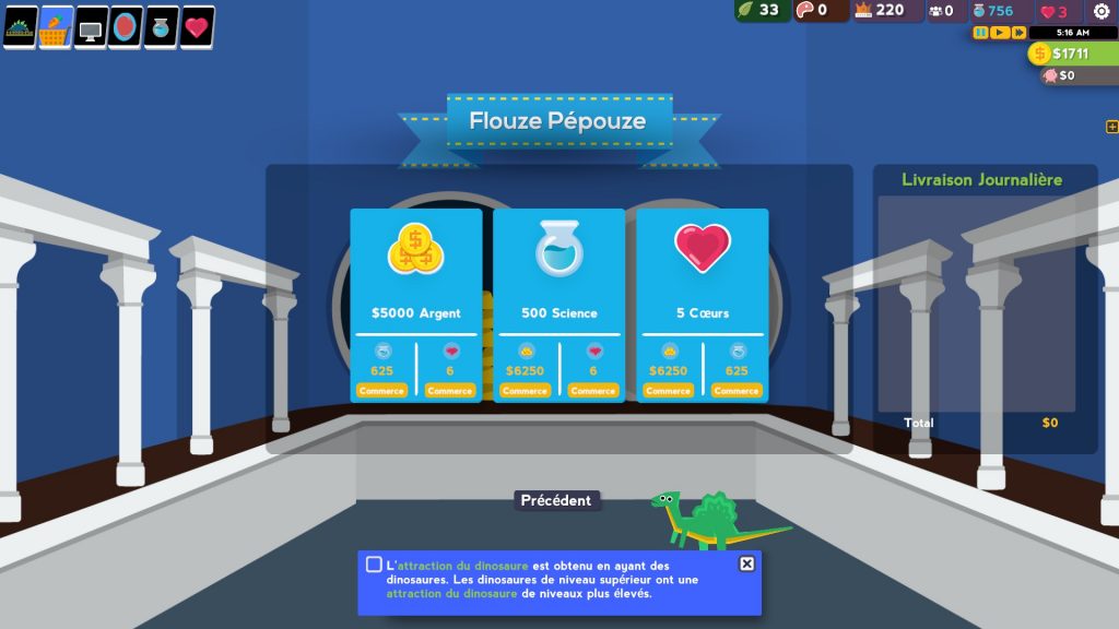 À noter : pour obtenir des points de science, il vous faudra des scientifiques qui feront « des recherches », vous en récolterez donc juste en jouant. Concernant les coeurs, il faudra que votre ou vos dinosaures soient heureux, ainsi plus ils le seront, et plus obtiendrez de coeurs.