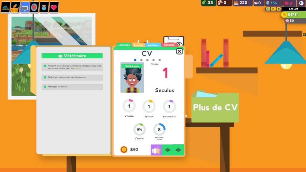 Vous allez en cliquant sur le dossier posé sur votre bureau, pouvoir feuilleter tous les CVs des futurs employés de votre parc, vous pourrez voir leur compétence et choisir en haut, si vous recherchez un scientifique ou bien un vétérinaire, etc.