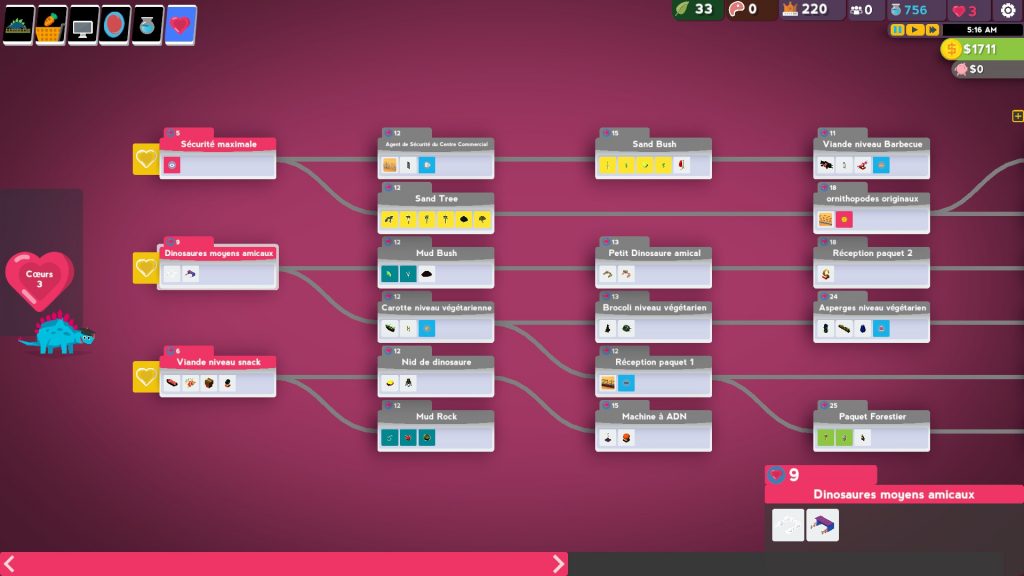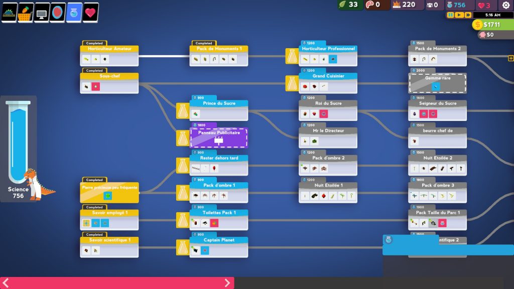 Concernant les deux dernières catégories : « Points de science » et « Cœurs », il s’agit d’arbres de compétences pour débloquer des items pour le parc, que vous pourrez ensuite acheter pour améliorer votre parc !