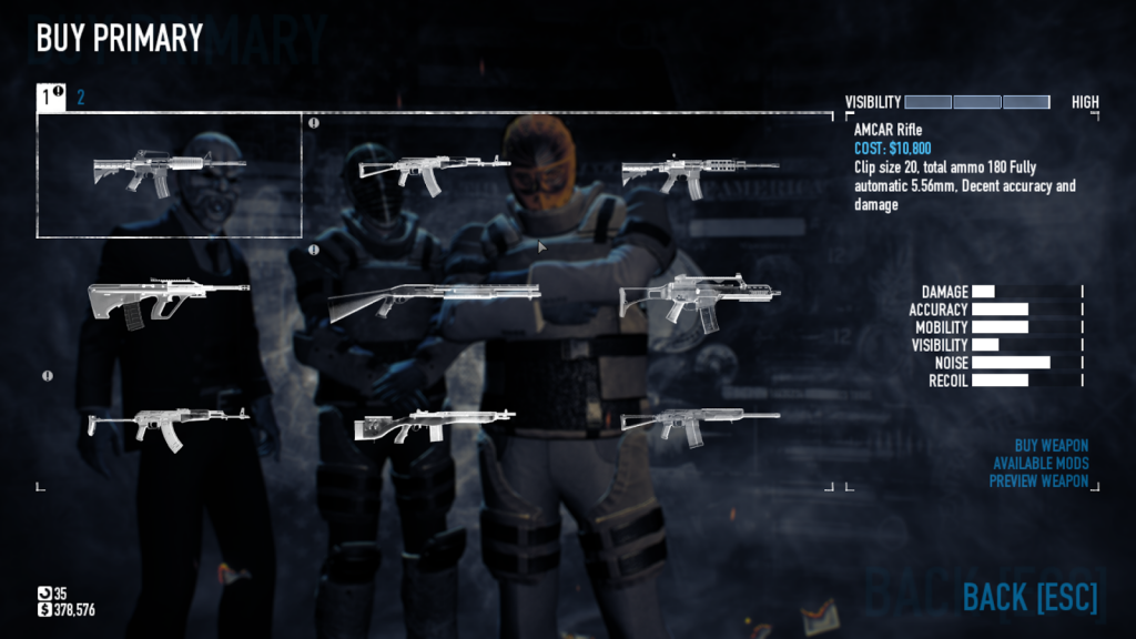 Parlons argent, eh oui, car si on fait des braquages et qu’on galère autant à récupérer de l’argent ce n’est pas pour faire jolie. Avec ces sous, vous allez pouvoir vous acheter de nouvelles armes ou des ajouts pour vos armes, il en existe quand même pas mal et de toutes les sortes, des fusils à pompe, des silencieux….