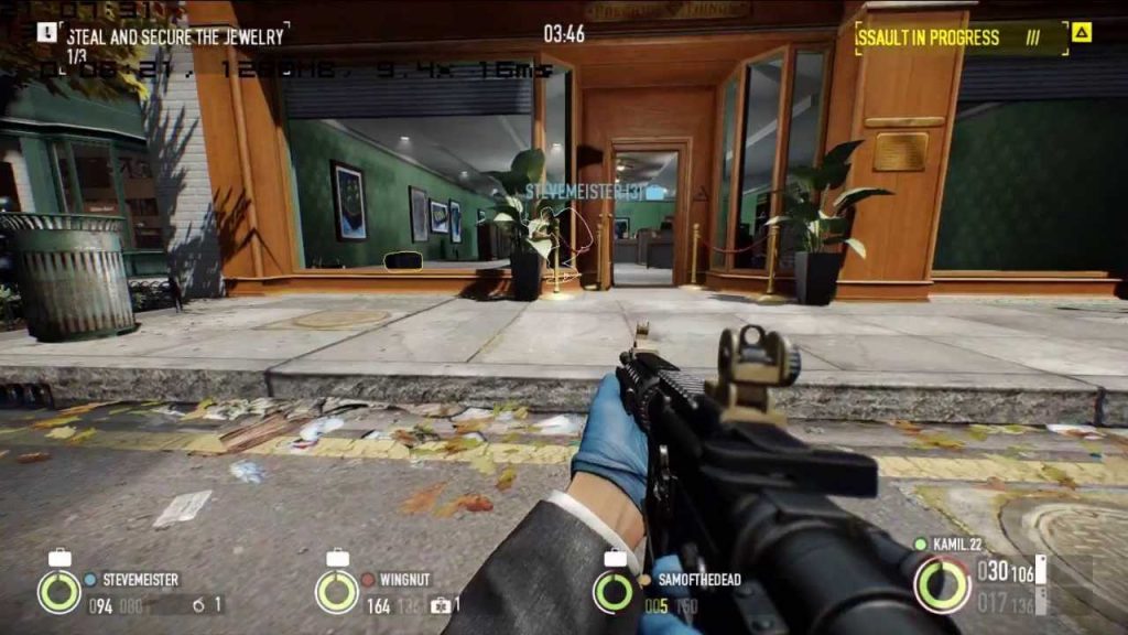 Ce que vous voyez en haut à gauche c’est là où les indications qu’il faudra suivre lors de la mission vont s’afficher, en bas vous retrouverez les pseudos, votre vie qui est le rond vert. Le rond blanc est votre bouclier, vous pourrez voir aussi les attaches qu’il vous reste pour ligoter les otages ou encore le nombre de balles restantes ainsi que par exemple vos kits de soins, de munition et autres atouts que vous aurez achetés en début de mission (dans le lobby avant de lancer la game).