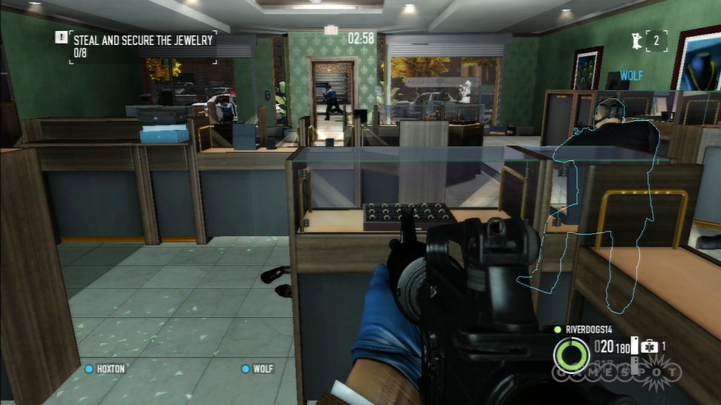 Lorsque vous allez commencer, vous ressemblerez à un civil portant un costard, ainsi vous allez pouvoir faire le tour du bâtiment et voir où se trouve les caméras (qui peuvent à tout moment vous détecter malgré votre apparence), le banquier qui a une carte magnétique pour atteindre la salle des contrôles pour les caméras (pour éviter que cela enclenche une alarme si l’une d’elles vous voit) ou encore où se trouve les gardiens.