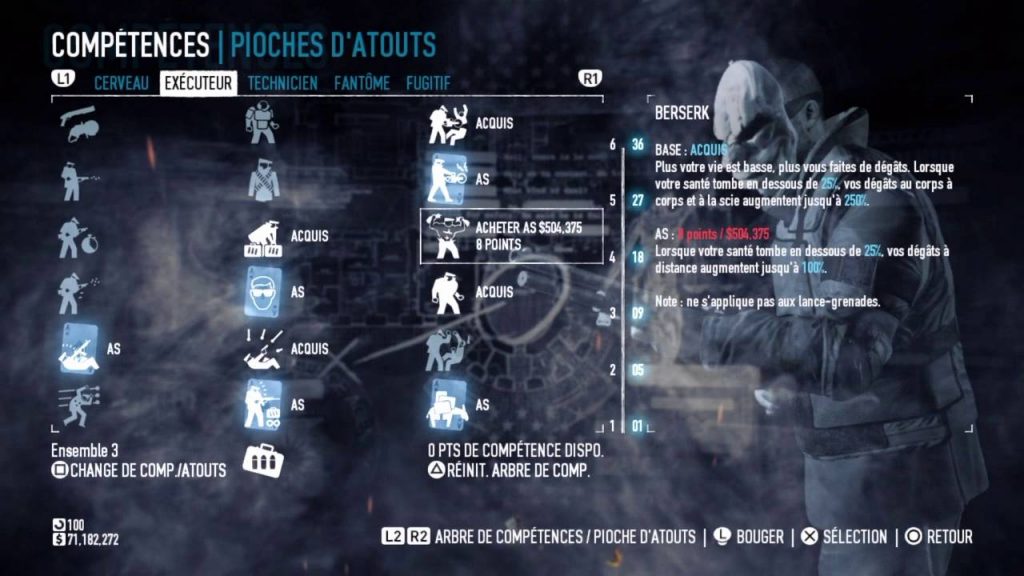 Pour ce qui est des compétences, vous aurez différentes catégories, elles vous permettront entre autres de pouvoir améliorer vos compétences de braquage comme l’intimidation, la possibilité de pouvoir soigner un pote en lui hurlant dessus au loin, d’avoir plus de sacs mortuaires pour cacher des cadavres.