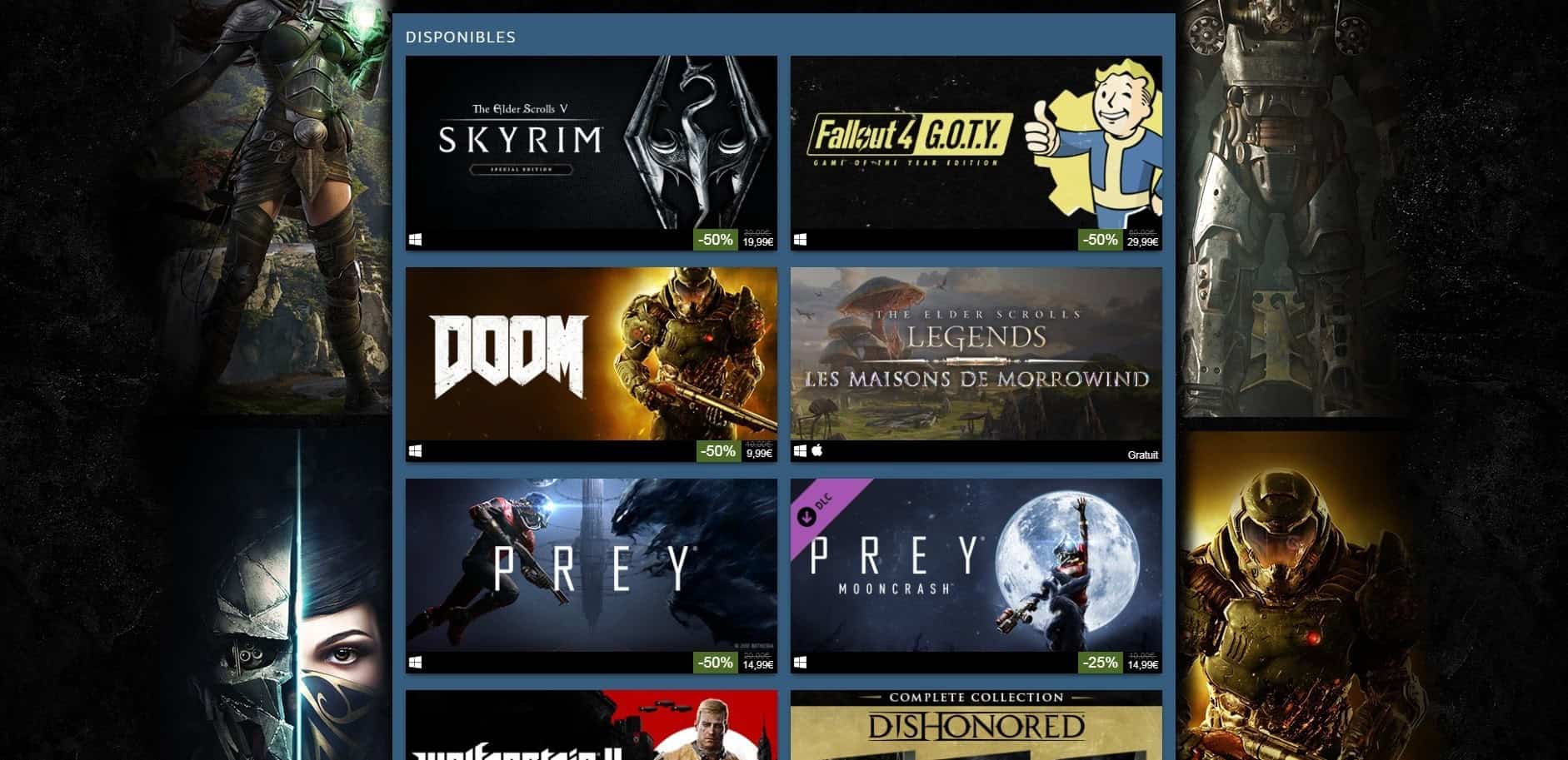 Effectivement, on peut y voir par exemple du Dishonored ou encore le célèbre jeu Skyrim, le tout pouvant aller jusqu’à -75% !