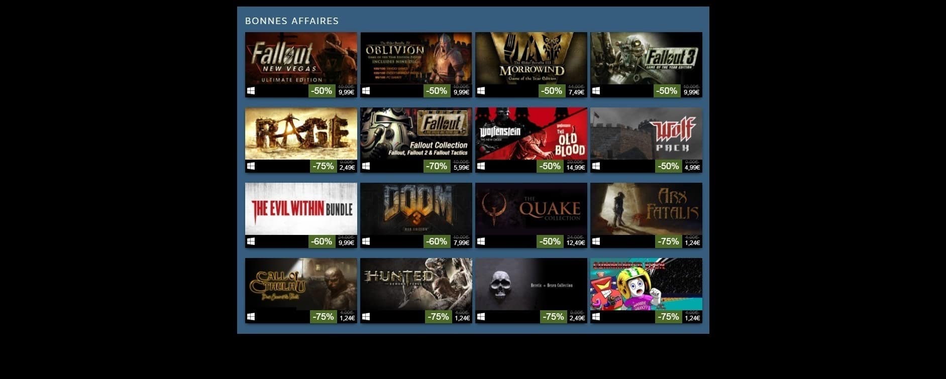 Il y a aussi les « bonnes affaires » avec Fallout 3 à 9,99€, The Evil Within bundles (avec des DLCs) à 9,99€ ou encore RAGE au prix de 2,49€.