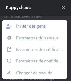 Rendez-vous tout d’abord sur votre serveur Discord (bien évidemment celui qui vous appartient, ou vous aurez les droits d’administration serveur, pas un serveur random), puis cliquer sur la petite flèche se trouvant à côté du nom de votre serveur et vous aurez donc une petite liste de plusieurs actions qui va apparaître (voir image ci-dessous).