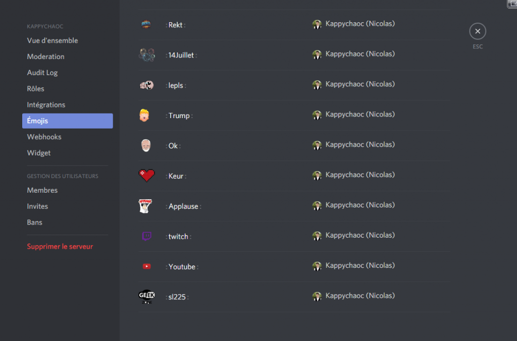 Ce n’est pas tout, vous allez aussi pouvoir changer « la manière » d’utiliser l’un de ces émojis et cela facilement, il vous suffit de vous rendre en les deux « : : » et d’y indiquer le mot que vous souhaitez que vos utilisateurs utilise afin de pouvoir l’employer dans le chat, exemple pour le logo Youtube j’ai indiqué :Youtube: par conséquent, toutes les personnes membres de mon serveur doivent taper à la lettre près cette « commande » pour faire apparaître le logo YTB. Si vous souhaitez en supprimer un, faîtes glisser votre souris sur le logo une croix rouge apparaîtra et il vous suffira de cliquer dessus pour faire supprimer l’émoji.