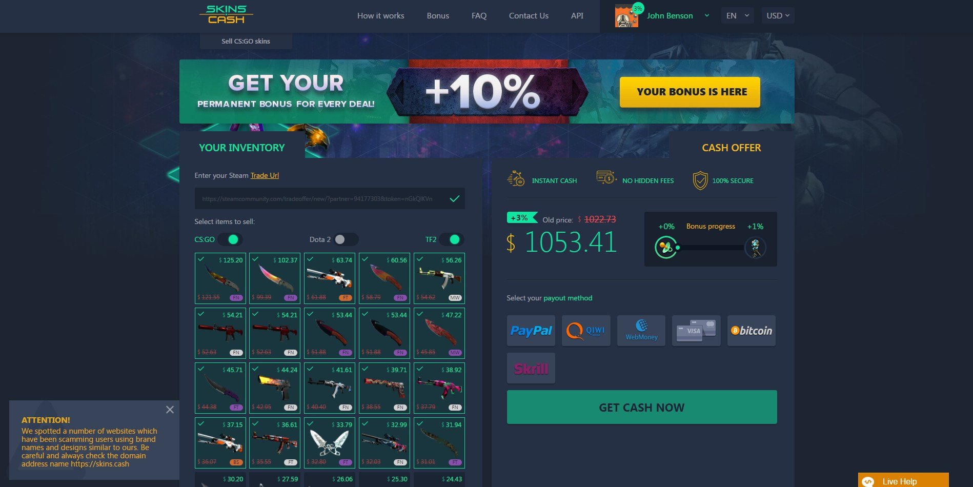 Dans cet article, je vous parlais notamment du site Skins.cash qui est un site qui vous permet de vendre vos skins en échange de quoi il vous envoie une vraie somme d’argent.