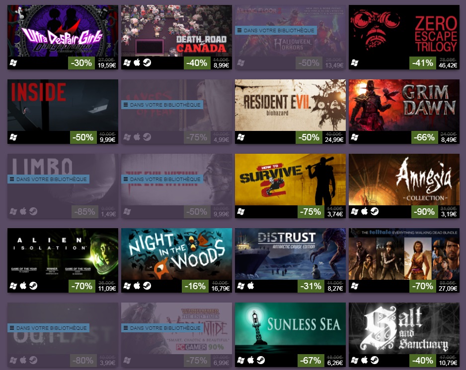 Vous les attendez depuis peut être un long moment et bien les voici, les soldes Steam spéciale Halloween qui vous faire mourir de peur, elles ont débuté hier jeudi 26 Octobre et elles finiront le 1 novembre, avec une énorme gamme de jeux d’horreur vous aurez de quoi vous régaler pour passer un Halloween sanglant et effrayant !
