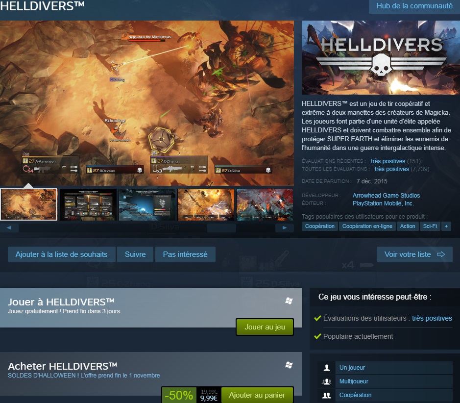 Vous pouvez aussi retrouver le jeu HELLDIVERS™ qui a une double promotion, l’une vous permettant de jouer pendant 3 jours gratuitement et l’autre étant que vous pourrez l’acheter pour la somme de 9,99€ seulement au lieu de 19,99€ !